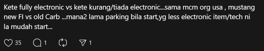“Fully electronic cars vs cars with less/no electronics… just like in the US, a new FI Mustang vs an old Carb… when parked for a long time, the one with fewer electronic items/technology is easier to start…”
