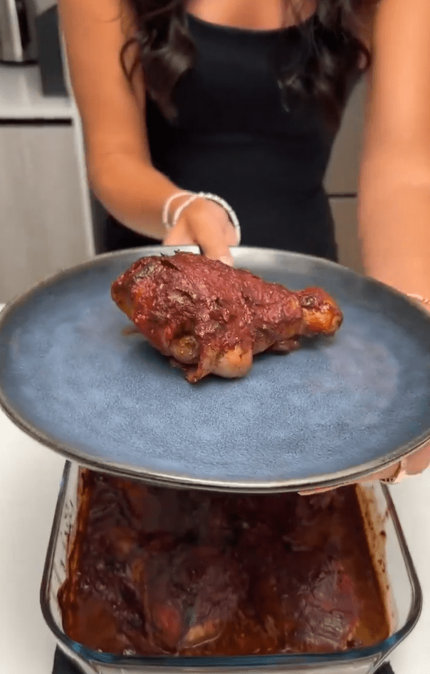 To top it off, she pours a prepared Milo drink over the chicken and uses a brush to coat each piece before baking. When she finally presents the roasted Milo chicken legs, their ordinary appearance contrasts with the unconventional marinade, leaving viewers uneasy.