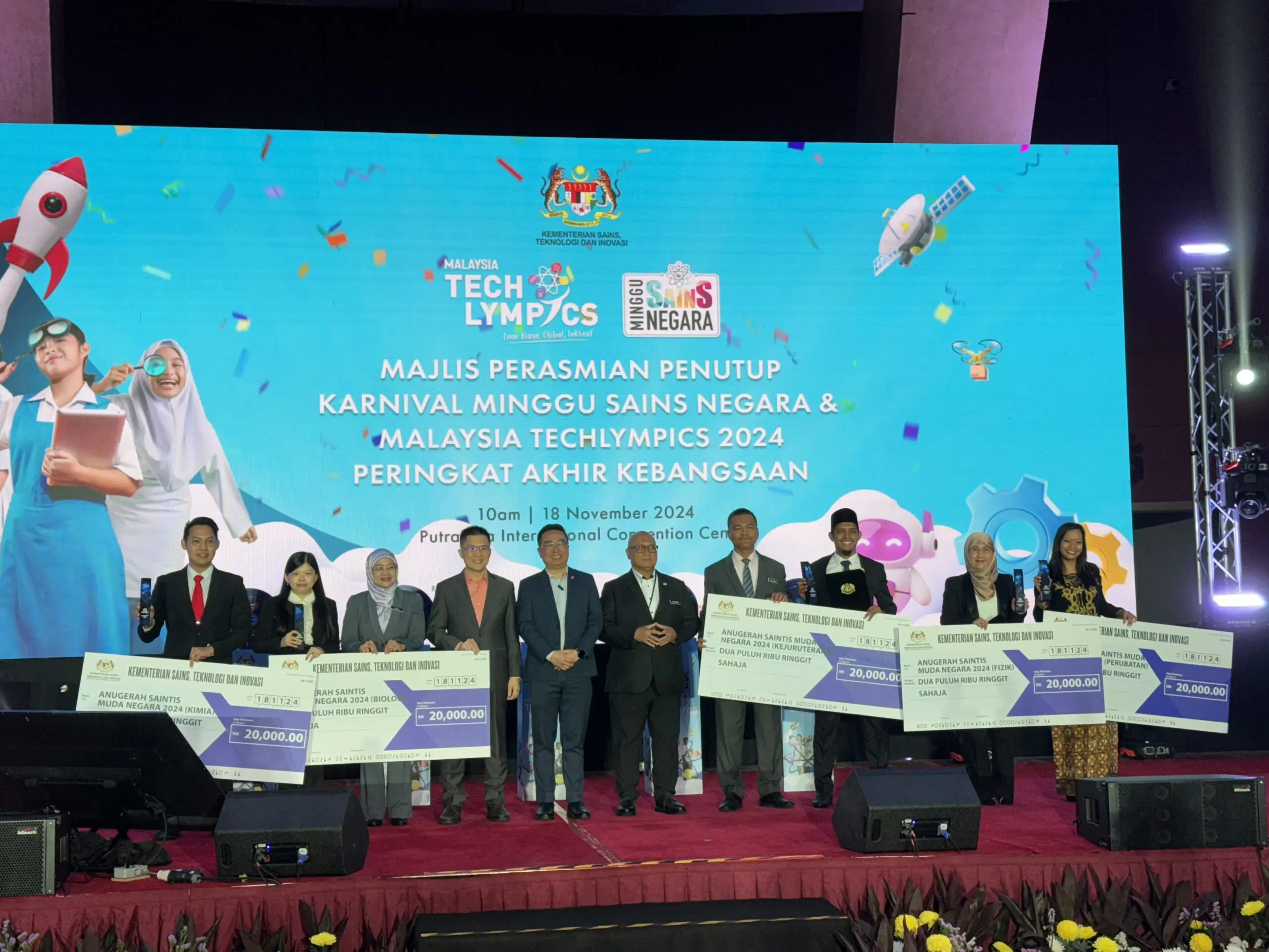 PUTRAJAYA, 18 NOVEMBER 2024 – The Ministry of Science, Technology, and Innovation (MOSTI) successfully organized two flagship Science, Technology, and Innovation (STI) programs, namely National Science Week (MSN) and the Malaysia Techlympics 2024 National Finals, simultaneously on 17–18 November 2024 at the Putrajaya International Convention Centre (PICC), Putrajaya.
