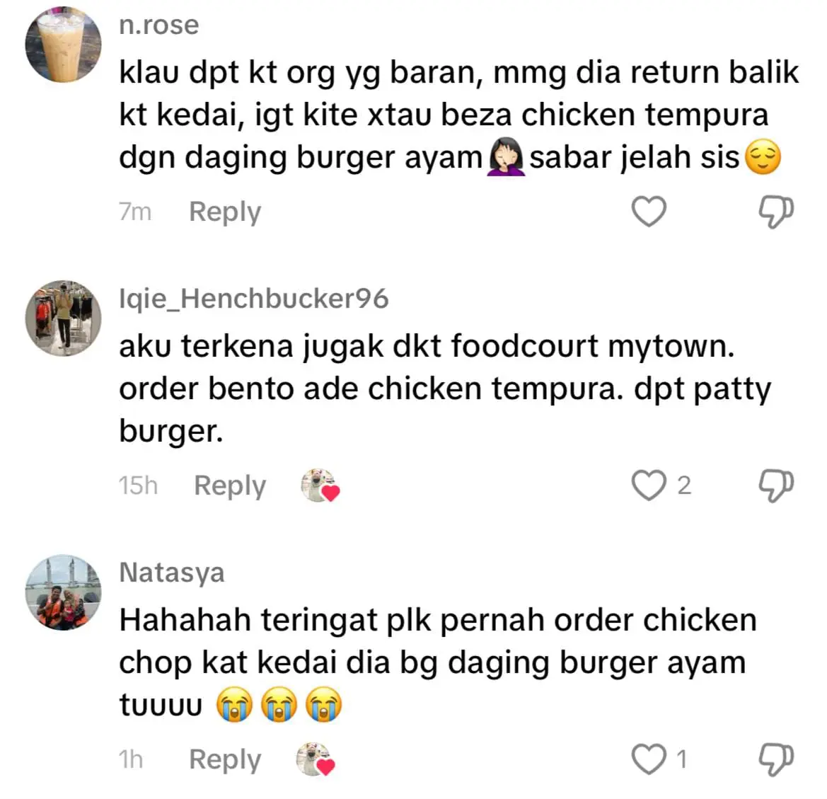 “Kau tahu tak, chicken tempura dia apa? Daging burger, burger ayam,” kata Aifa.
