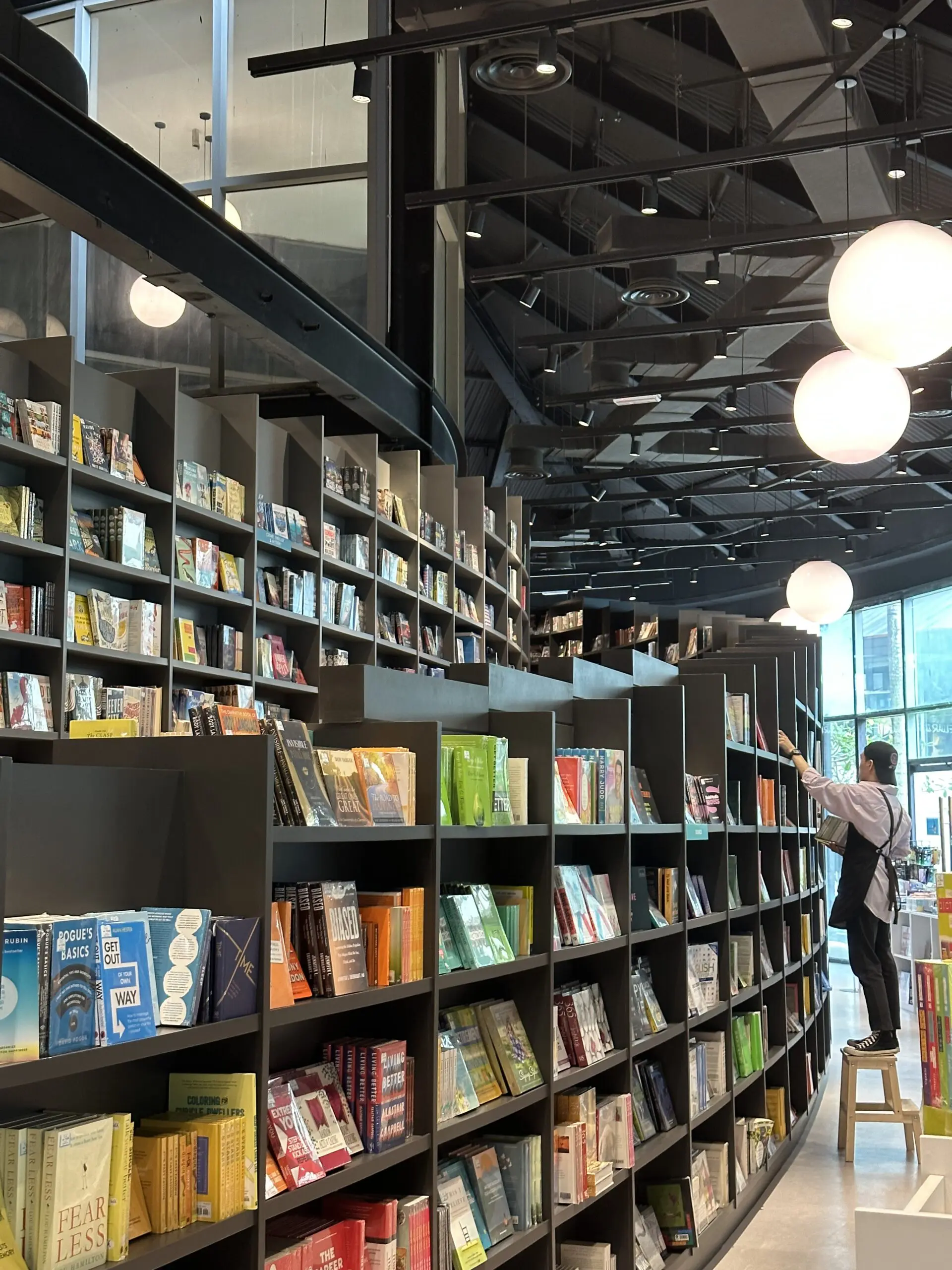 The design is modern yet inviting, offering a comfortable space to lose yourself among pages. Floor-to-ceiling windows allow the space to be bathed in natural light, while simultaneously offering you a stunning view of the cityscape.