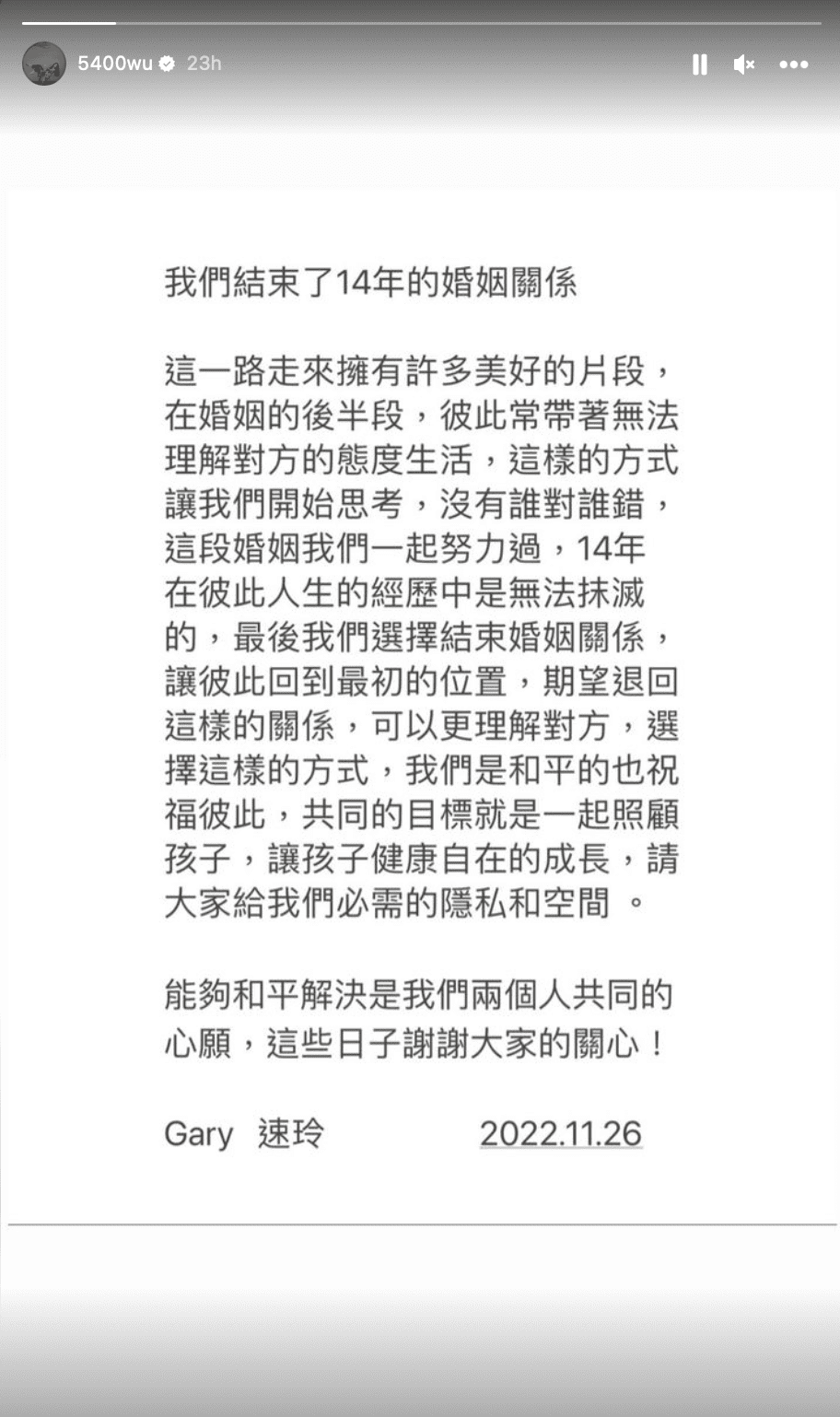 Gary Chaw and Wu Shu-ling released the same statement on their Instagram that recounted their beautiful memories together.