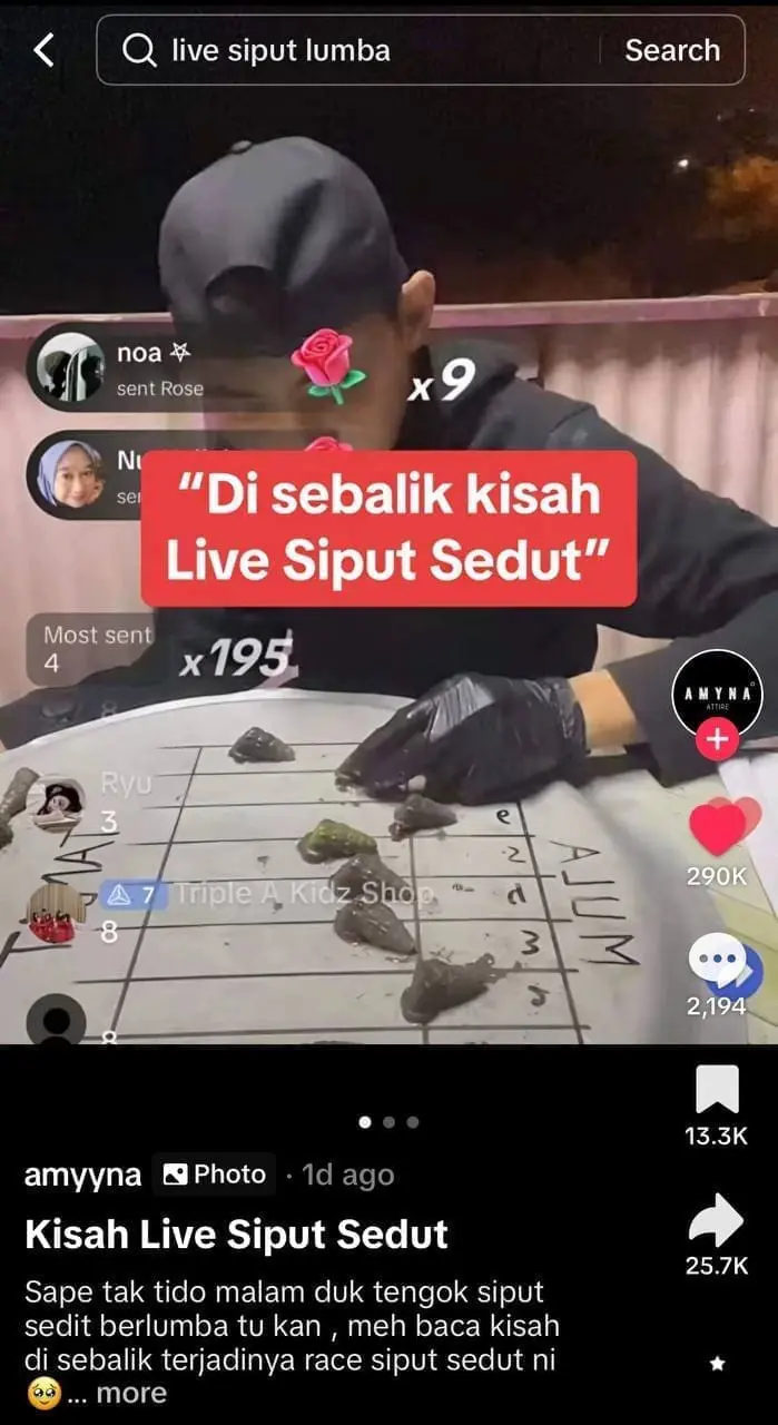 “Maka, jadi lah siput sedut race. Gift yang dapat cecah beratus ribu setiap kali live.. asbab dari tolong seorang hamba Allah, mencurah rezeki buat dia,” kongsi tangkap layar yang dibuat oleh amyna.