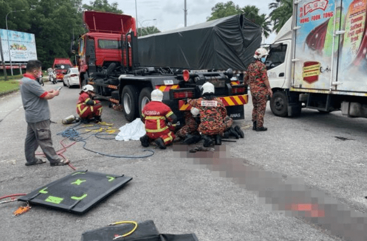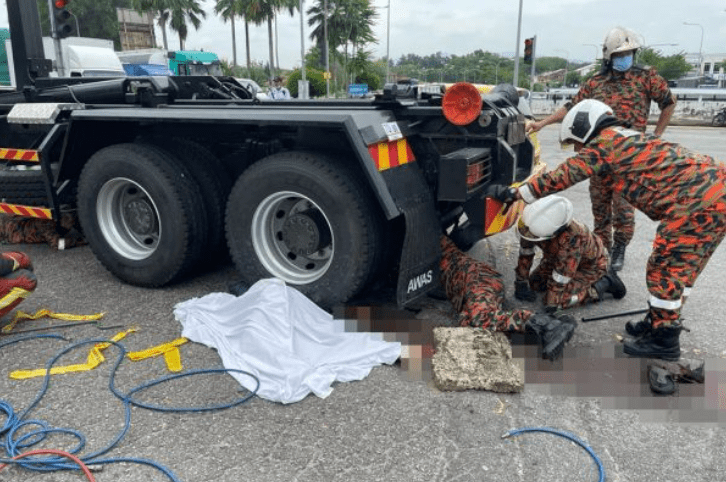 Rescuers dispatched to the scene had to prop up the tow truck’s back wheels using a car jack and extracted whatever was left of the mangled body before it was sent to the Tunku Ja’afar Hospital for an autopsy.