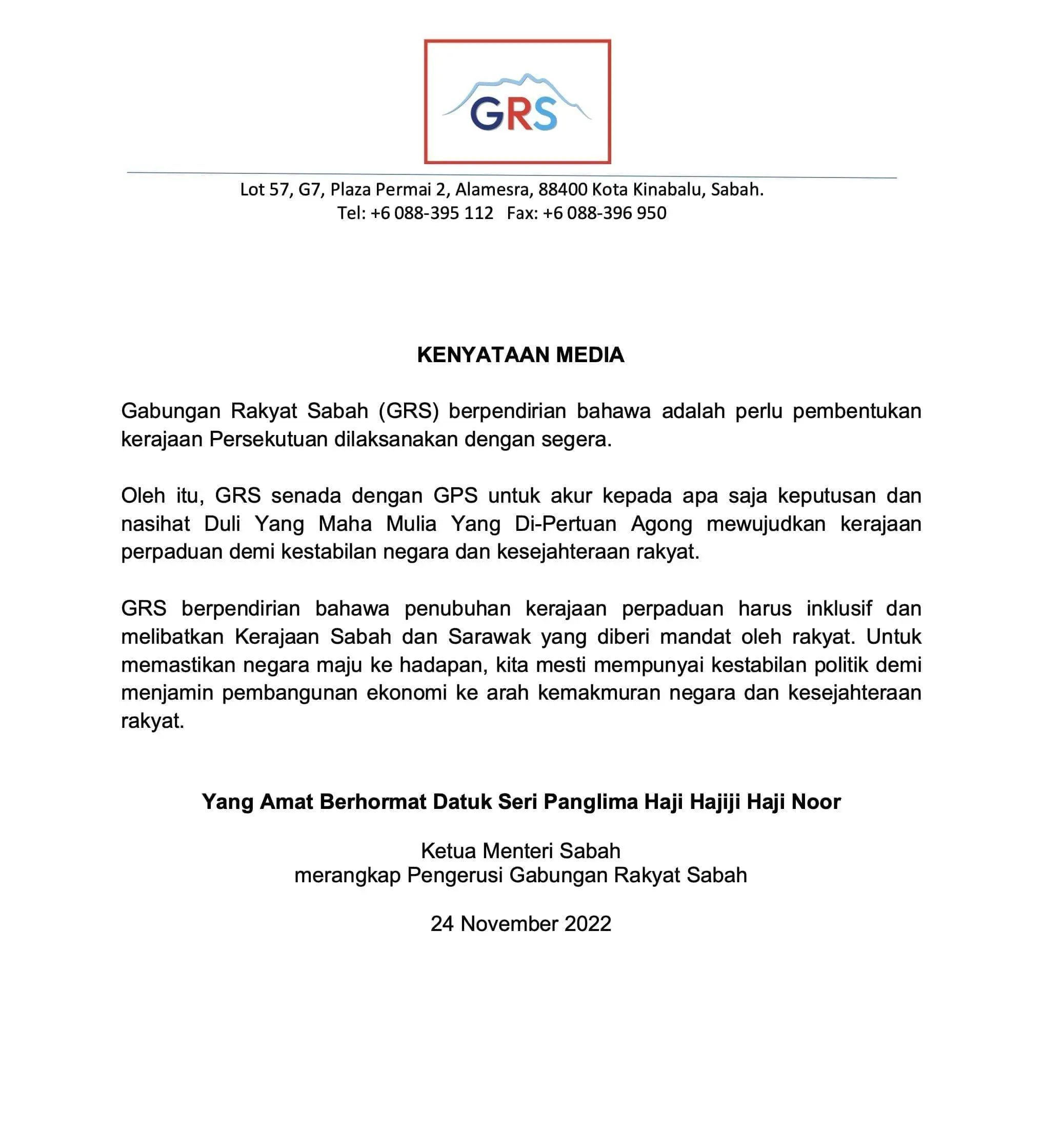 In a statement, GRS says they are “in tune with GPS” to accept whatever decision and advice from the Agong to create a unity government for the nation’s stability and the rakyat’s wellbeing.