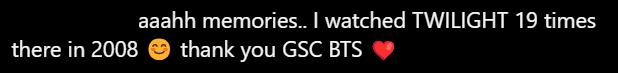 Another netizen fondly recalls the countless times she watched ‘TWILIGHT’ at the theatre in 2008, and also expressed her gratitude towards GSC.