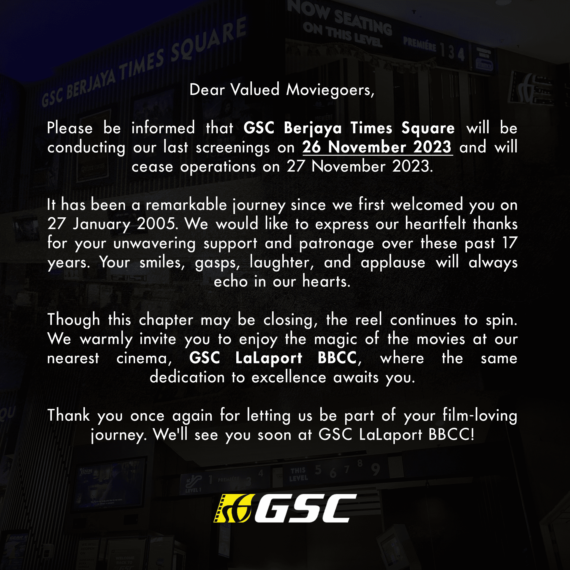 Golden Screen Cinemas (GSC) Berjaya Times Square has announced it will be shutting down, with its final screenings scheduled for 11/26/23, and officially ending operations on 11/27/23.