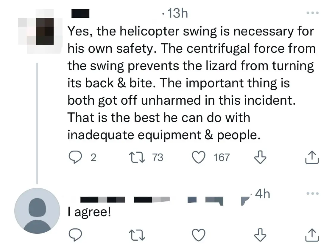 .@KKCity guard seen in this clip tossing away in “helicopter swing” monitor lizard which crawled into public space.