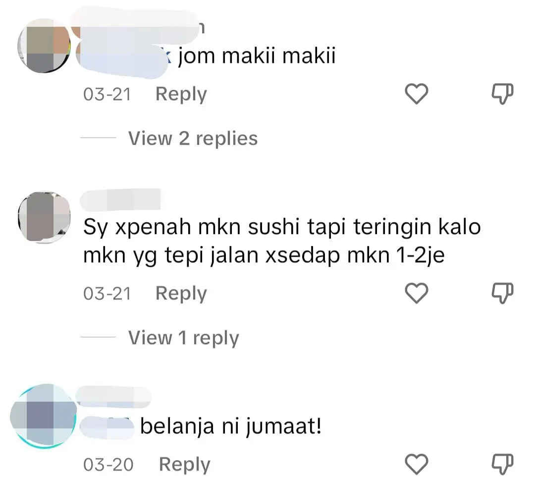 Menelusuri ke ruangan komen, warganet terliur melihat keenakan sushi di Makii Makii dan ada juga yang kempunan masih tidak dapat merasai makanan terbabit sehingga kini.