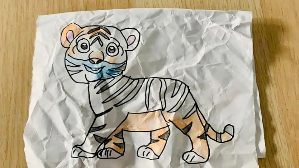On the second design, he accidentally coloured the tiger blue, causing him to crumple it up out of frustration.