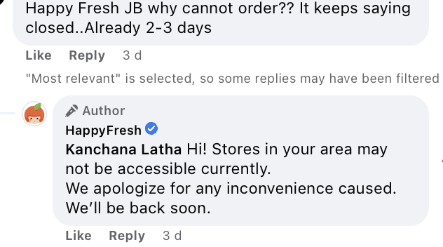 A message on HappyFresh Malaysia application shows that the company is facing some issues that are taking longer to resolve than they expected.