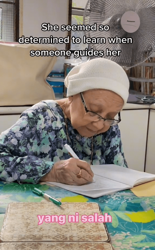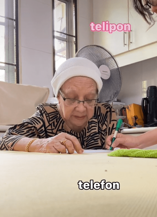 In the video, the grandma could be seen learning how to spell a few words in Bahasa Malaysia such as “kerajaan”, “tuala”, “mangkuk”, “telefon” and more.