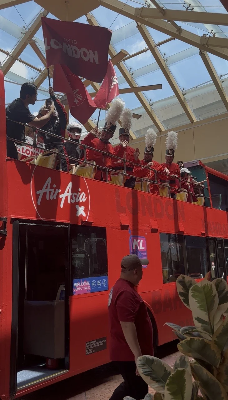 Have you seen the viral video that’s buzzing on social media showing a red AirAsia supercar and double decker bus roaming around KL giving out free merch and even a return flight to London or Bahrain to lucky participants?