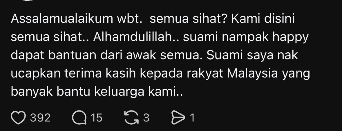 The wife later posted an emotional update, thanking Malaysians for the overwhelming kindness shown to her family.