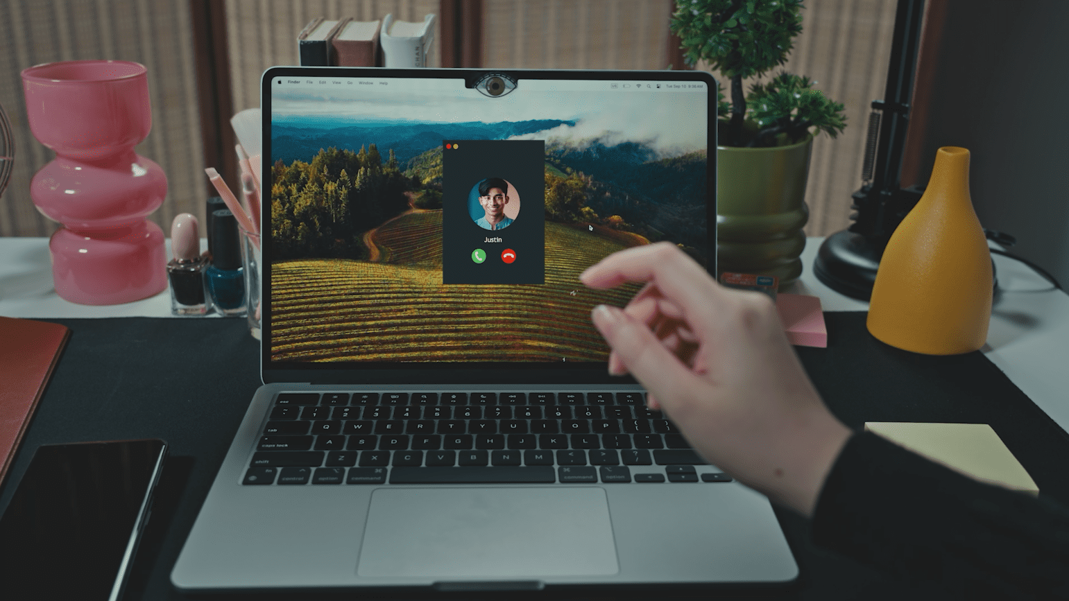 After a moment of panic, she realises she’s left her laptop camera uncovered and quickly places a sticker over it, something many MacBook users can relate to.