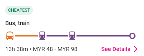 For instance, the cheapest way to get from KLCC to Kota Bahru would need you to get onto the Bukit Nanas train to Titiwangsa, then ride a 2 hour long bus Kuala Lipis, switch to train again to reach Wakaf Bahru and finally get a taxi ride of 6 minutes to Kota Bahru.