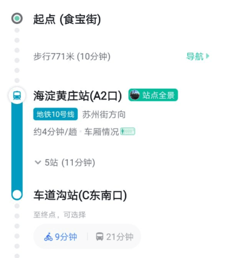 For example, just by keying in your destination, Baidu Maps will tell you how long the whole journey will be; the amount of stations you will need to be passing, your total walking or cycling distance, and the cost spent with a linear timeline showing the different modes of transport you will need to take throughout the whole journey;