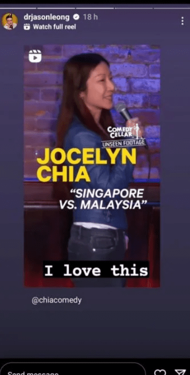 Dr. Jason Leong further showed his support by sharing Chia’s performance clip on his Instagram story, stating, “I love this.”