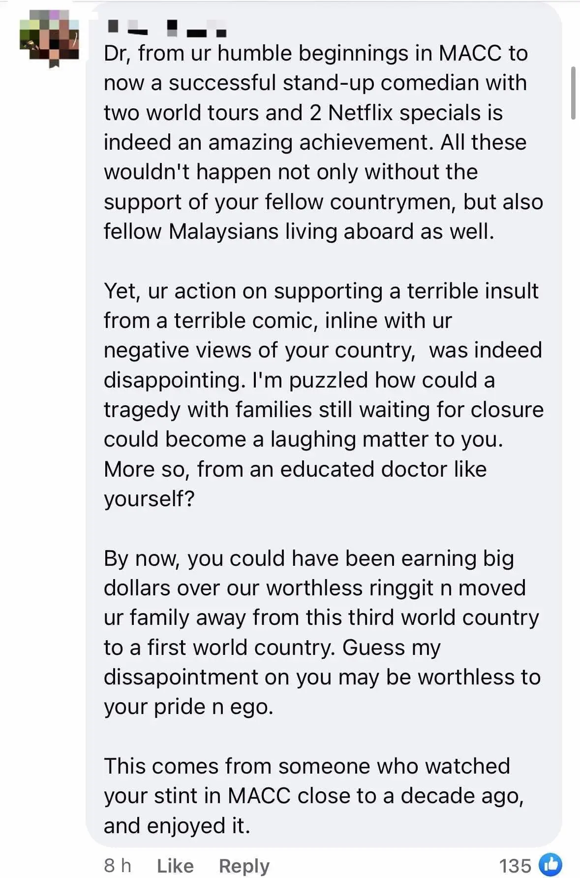 In response, Malaysian netizens criticized Dr. Jason Leong’s comments, expressing disbelief that he would endorse a foreign stand-up comedian who insulted Malaysia in such a manner.