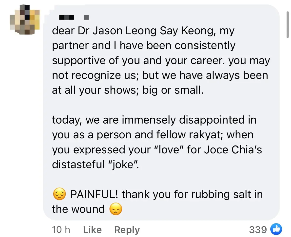 Local stand-up comedian Dr. Jason Leong received widespread criticism online from Malaysian netizens after publicly expressing his support for Jocelyn Chia’s controversial comedy performance.