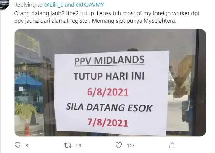 According to the tweet, one of the foreign workers paid RM100 to travel from KL to Midland Convention Centre (MCC) in Shah Alam to get vaccinated, only to find out it was closed.