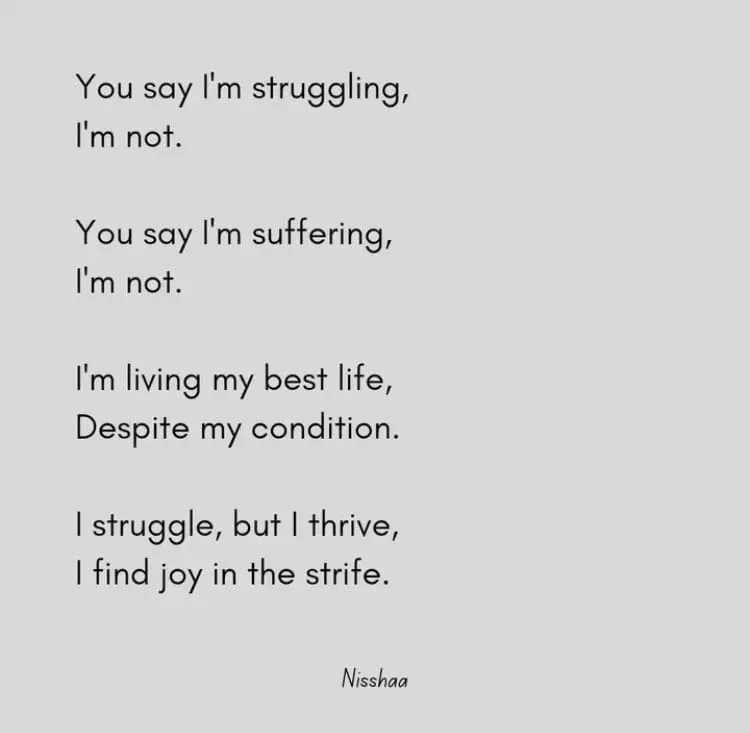 Nisshaa told me that her love for poetry began when she joined a literature club during her early years and found it to be an excellent way for her to express her thoughts and emotions in living with dystonia, adding that her poems are mostly ‘free style’.