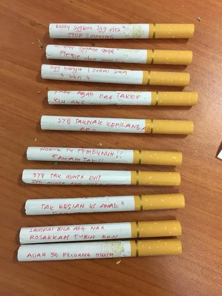 These photos, gaining attention on the Facebook page “Viral Muafakat Johor”, showcase a series of heartfelt notes she wrote, with one particularly striking message reading, “If you love me, quit smoking”.