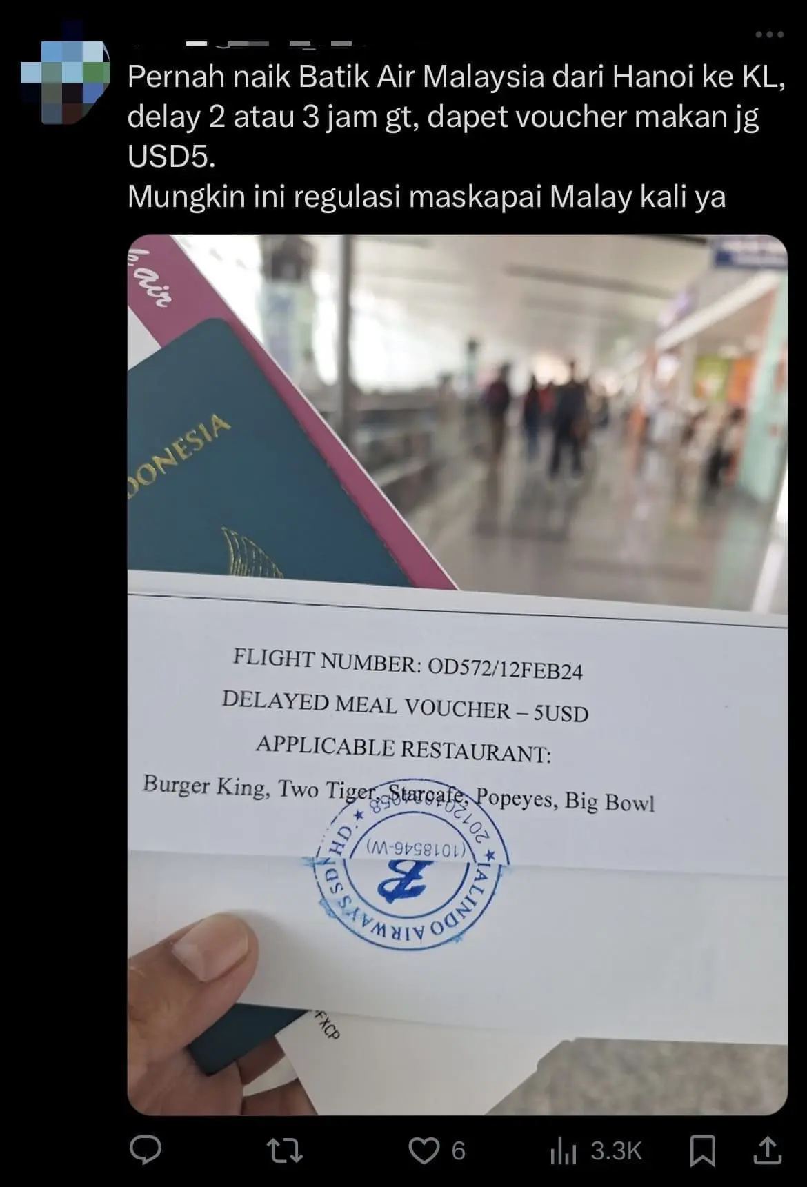 How can it be that when a flight is delayed, they give out meal vouchers worth around 120,000 rupiah (approx. RM35)? It should’ve just been a biscuit and mineral water. So generous. Aren’t they afraid of losing money? Must be a rare occurrence.”