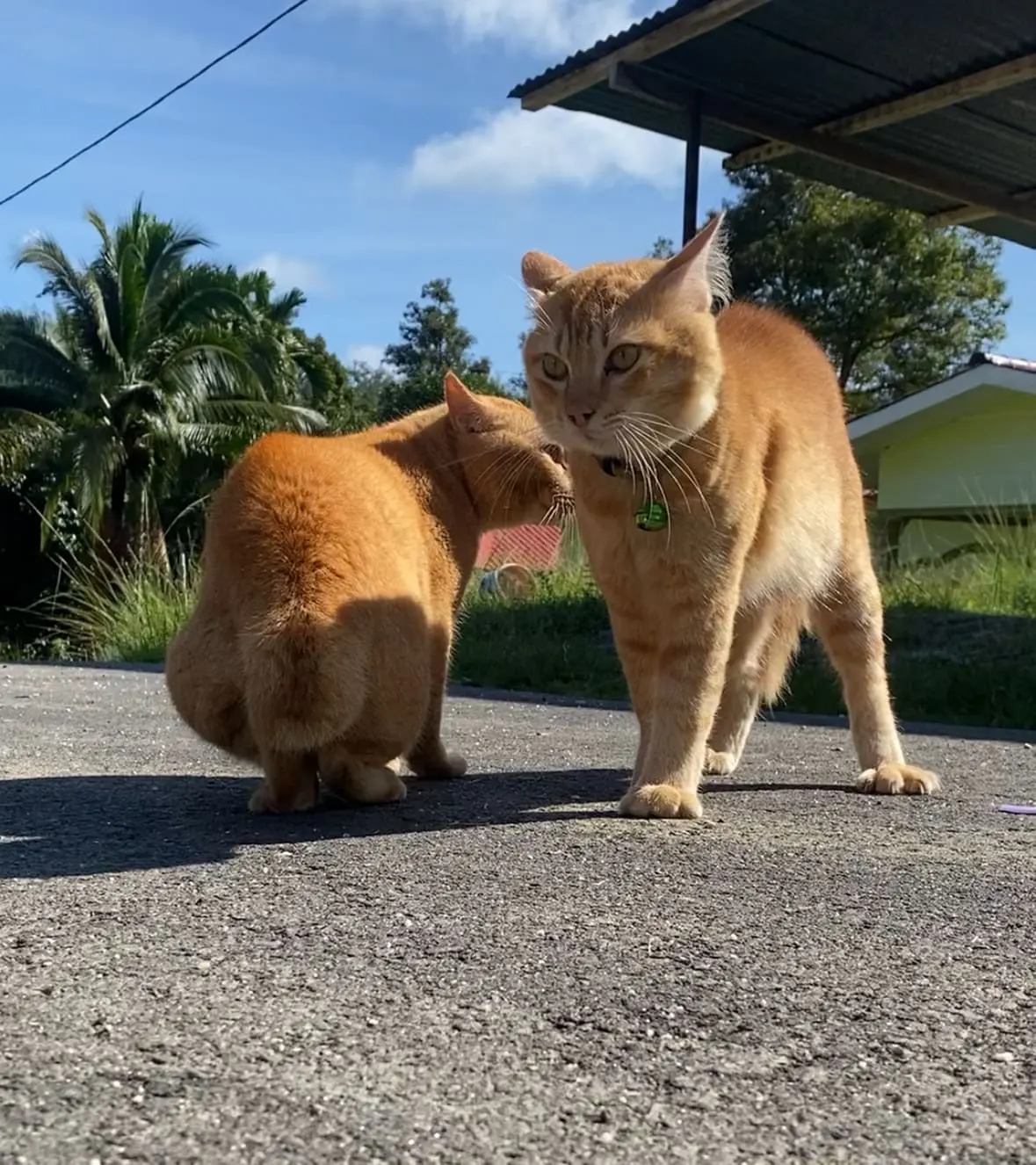 Instead of the claws-out showdown you’d expect, these two oyens (Malaysia’s beloved orange cats) decided to freeze up like they’d forgotten how to cat.