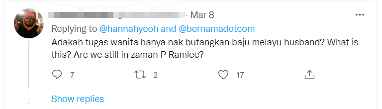 One wrote, “Is it a woman’s job to button their husband’s shirt? What is this? Are we still in P. Ramlee’s era?”