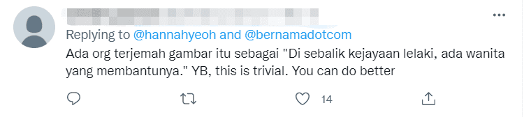 Another wrote, “Some interpret this picture as ‘Behind every successful man is a woman.’ YB [Hannah Yeoh], this is trivial. You can do better.”