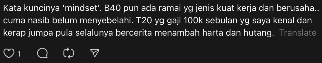 The OP later revealed that he identifies as part of the B40 group, but is actively trying to learn from the mindset he associates with the T20.