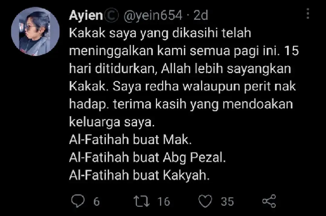 On Monday (August 9), Ayien posted another Tweet announcing his sister’s demise after spending 15 days in a comatose state. He also thanked those who had prayed for him.