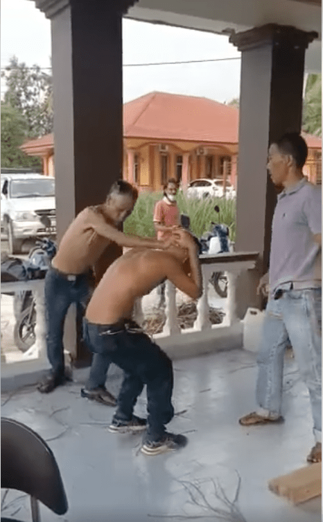 A separate video later showed the man cowering in fear from a group of villagers who beat him up for assaulting his stepfather.