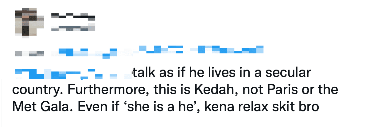 “Talk as if he lives in a secular country. Furthermore, this is Kedah, not Paris or the Met Gala. Even if ‘she is a he’, have to relax a bit bro.”