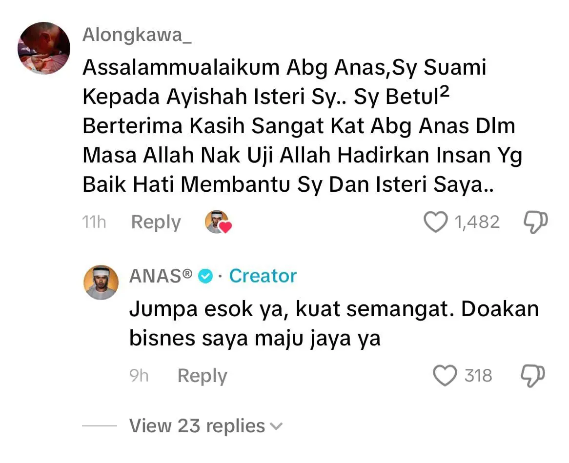 “Saya betul, berterima kasih sangat kat Abang Anas. Masa Allah nak uji Allah hadirkan insan yang baik hati membantu saya dan isteri saya,” tulis suami Ayishah.
