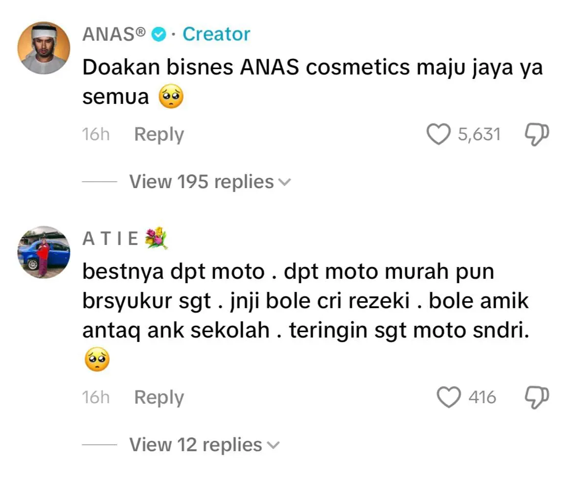 “Doakan bisnes ANAS cosmetcis maju jaya ya supaya saya boleh berkongsi rezeki dengan semua,” tambah Anas lagi.