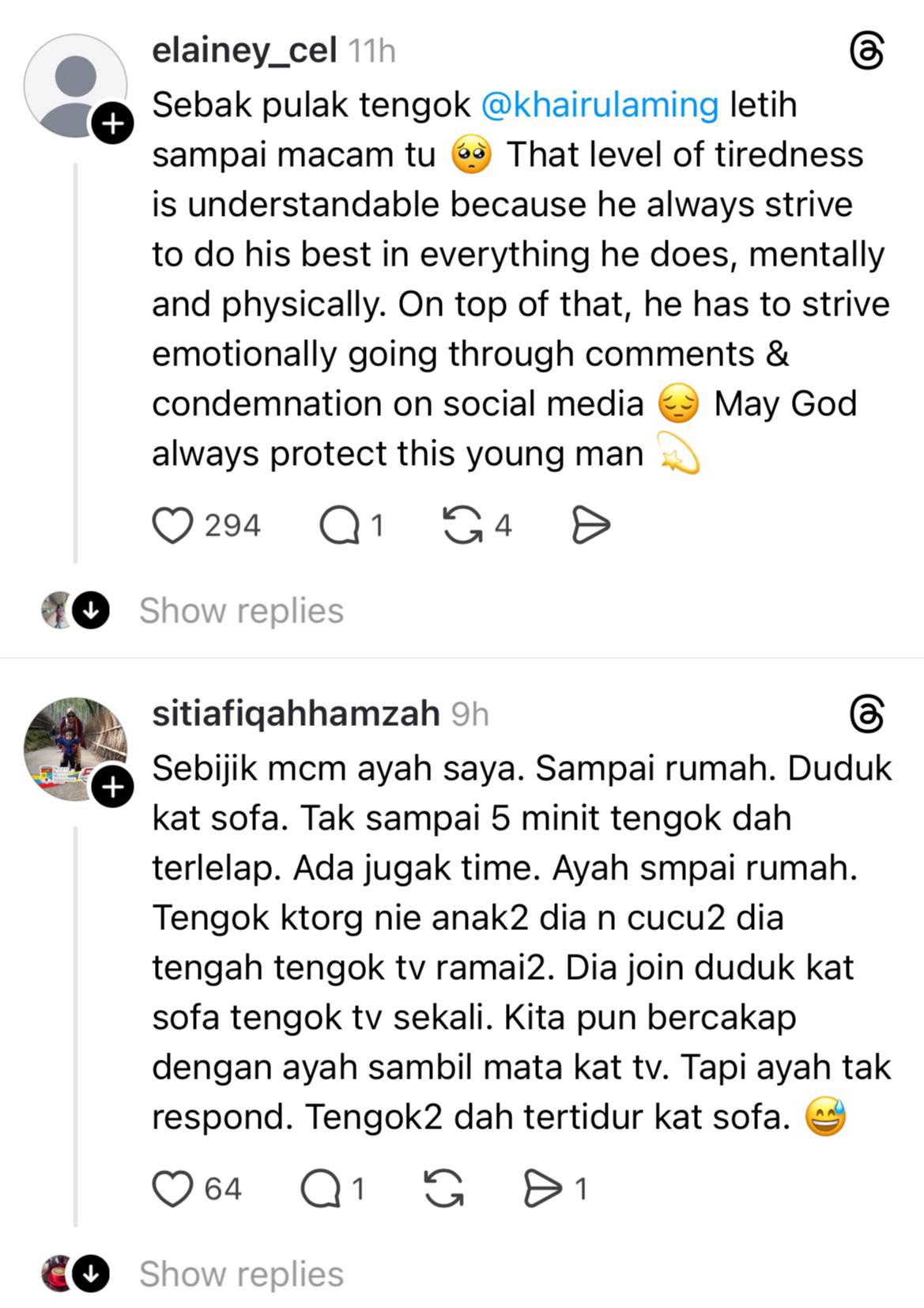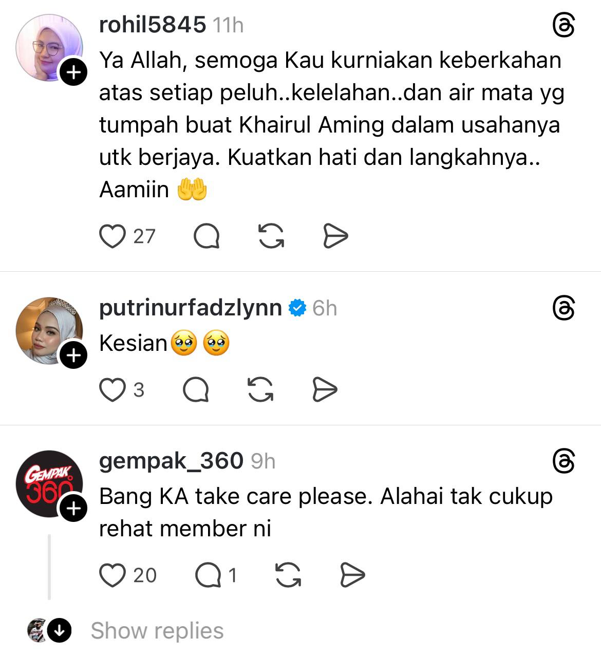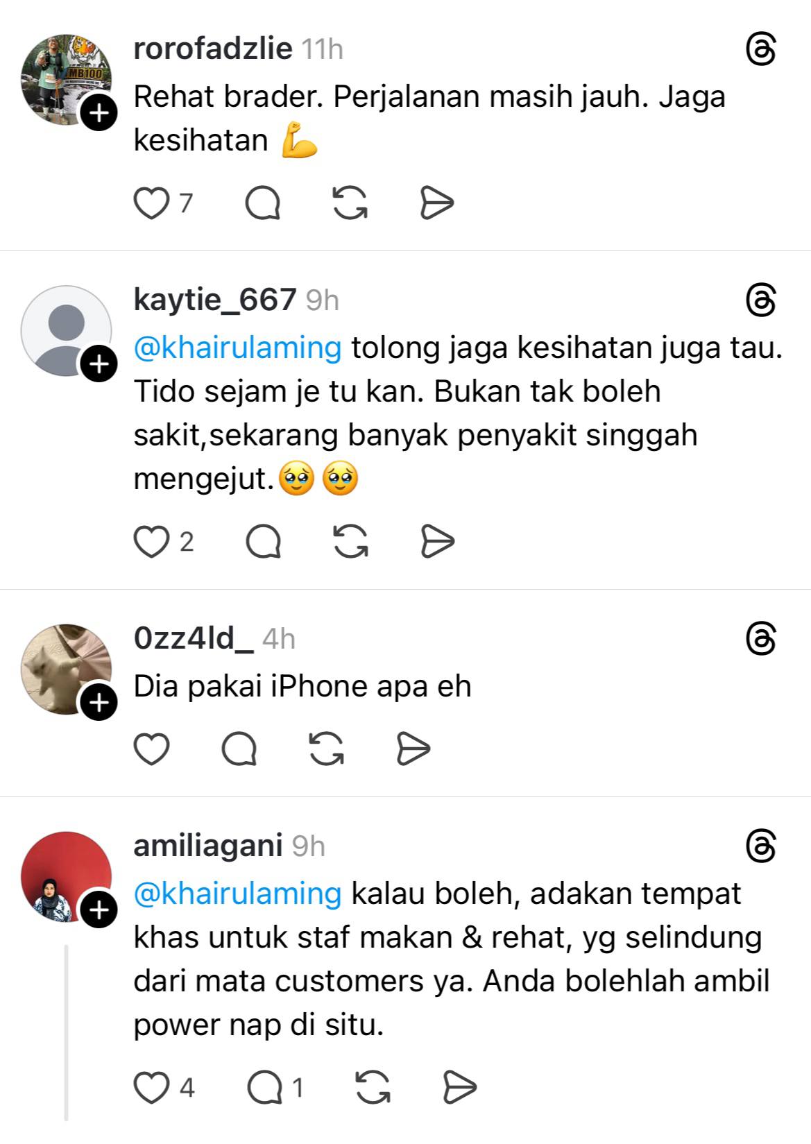 Menerusi perkongsian di Threads, individu yang memuat naik hantaran itu berharap Khairul Aming atau mesra disapa sebagai KA mengutamkan kesihatan serta mendapatkan rehat yang cukup.