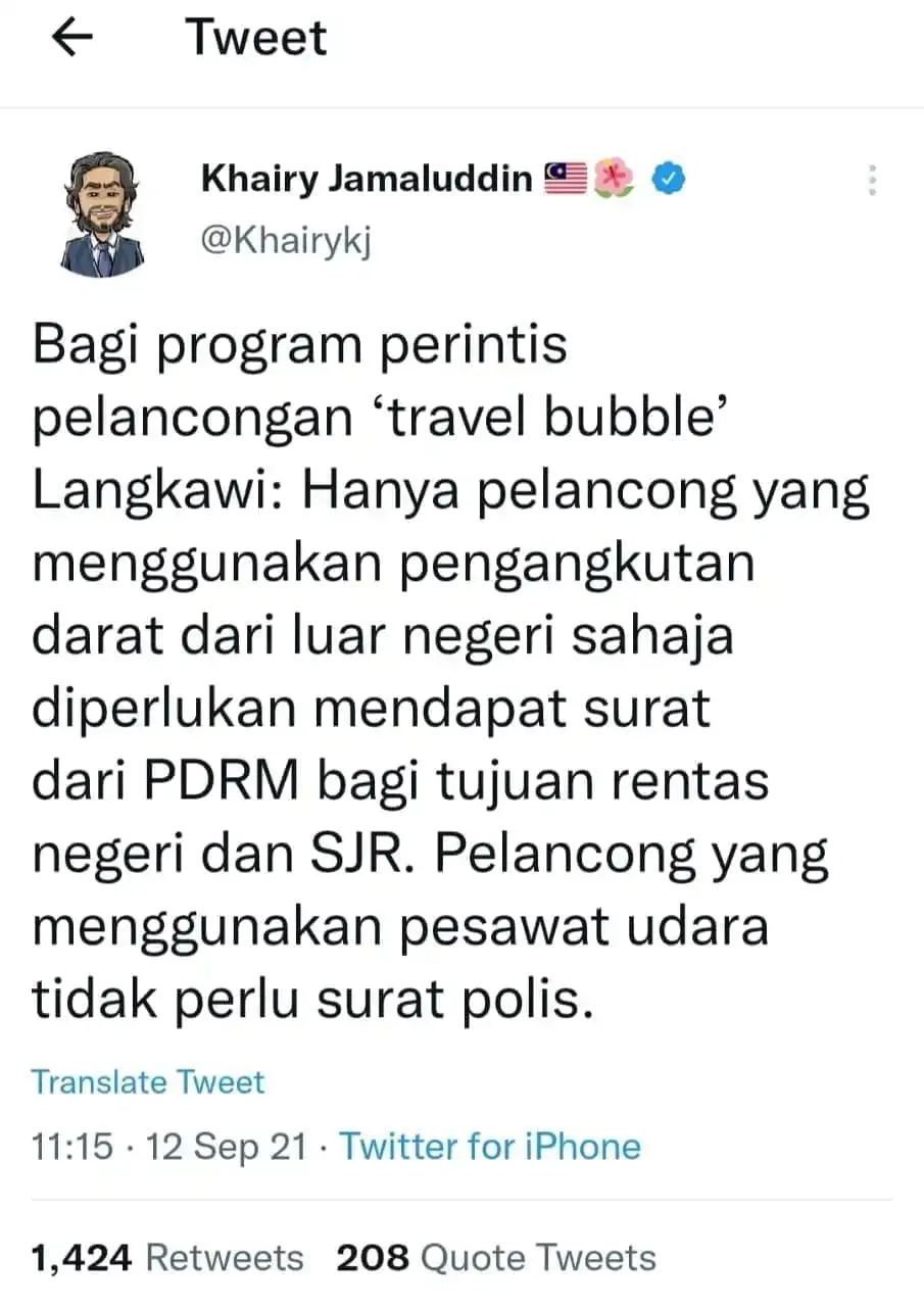 Today, Health Minister Khairy Jamaluddin Abu Bakar tweeted that tourists who flies to Langkawi will not need a letter from Royal Malaysian Police (PDRM).