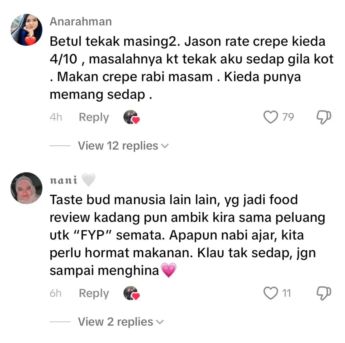 Usahawan dan pempengaruh Kieda Crepe, berkongsi pendapat tentang isu melibatkan seorang pencipta kandungan dan food reviewer yang sedang tular di media sosial.