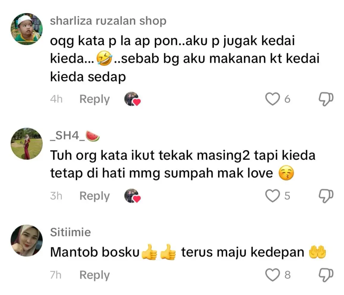 Meninjau ke ruangan komen, wargamaya bersetuju dengan pendapat Kieda dan ada juga yang memuji usahawan itu kerana sentiasa tampil positif biarpun serin menerima kecaman daripada netizen.
