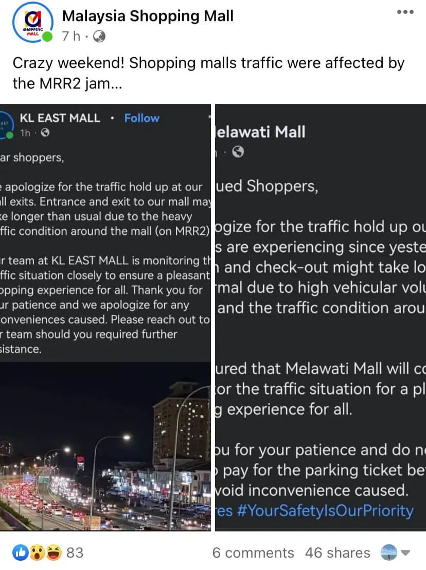 A shopping mall named KL East Mall posted an official apology message on Facebook in response to the major traffic delay that happened at MRR2 and caused annoyance to its customers.