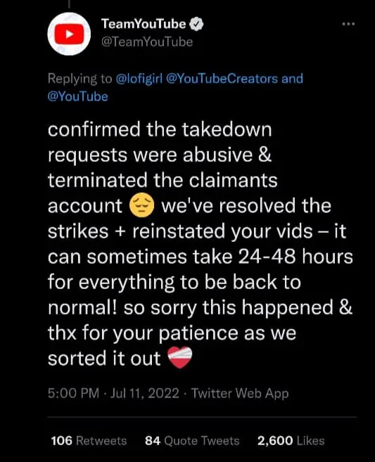 They also called out YouTube for failing to check the validity of the copyright strike before taking down the stream.