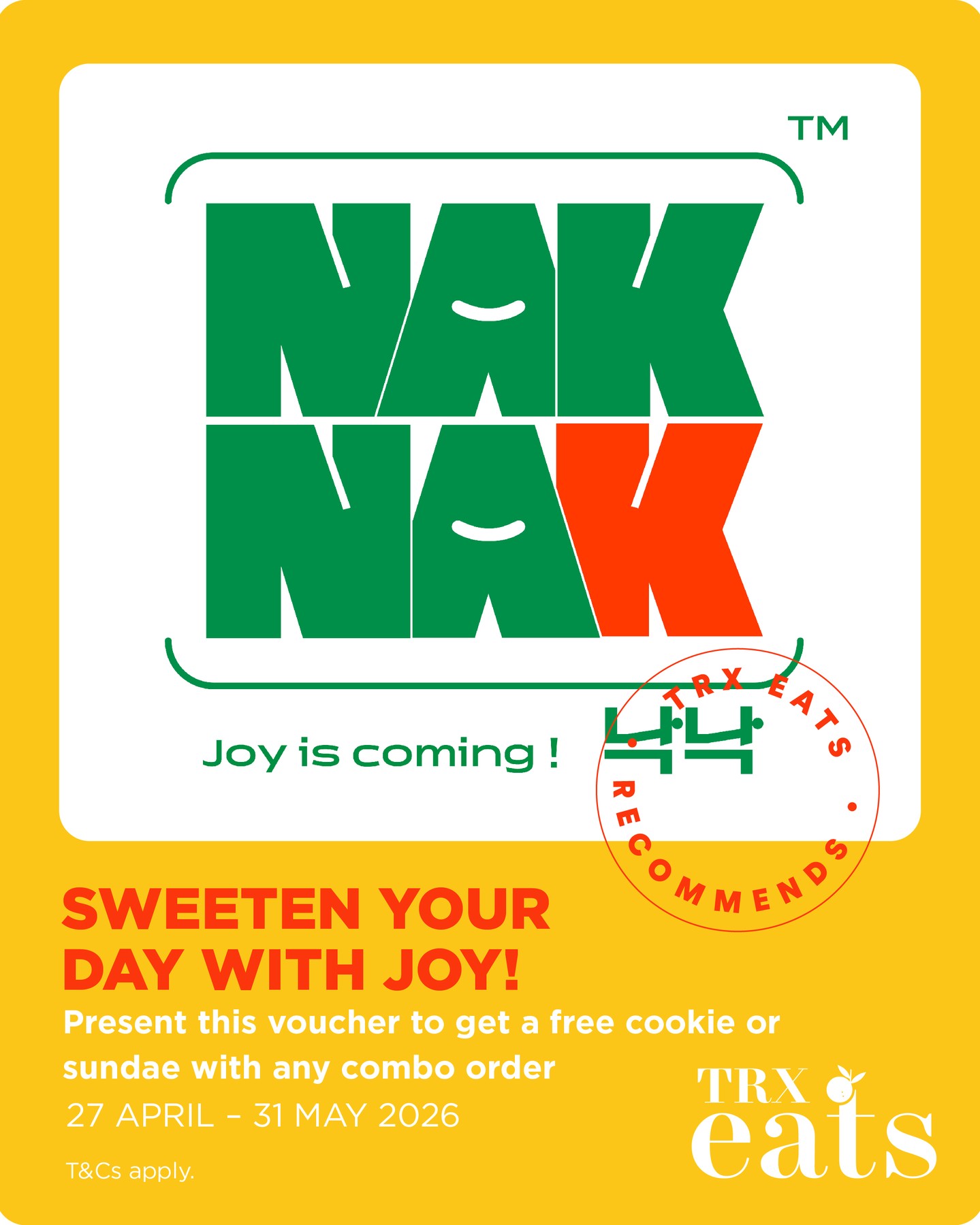 Over at Nak Nak, present your voucher that can be collected at any of the TRX Eats installations around the mall to redeem a free cookie or sundae with any combo purchased.