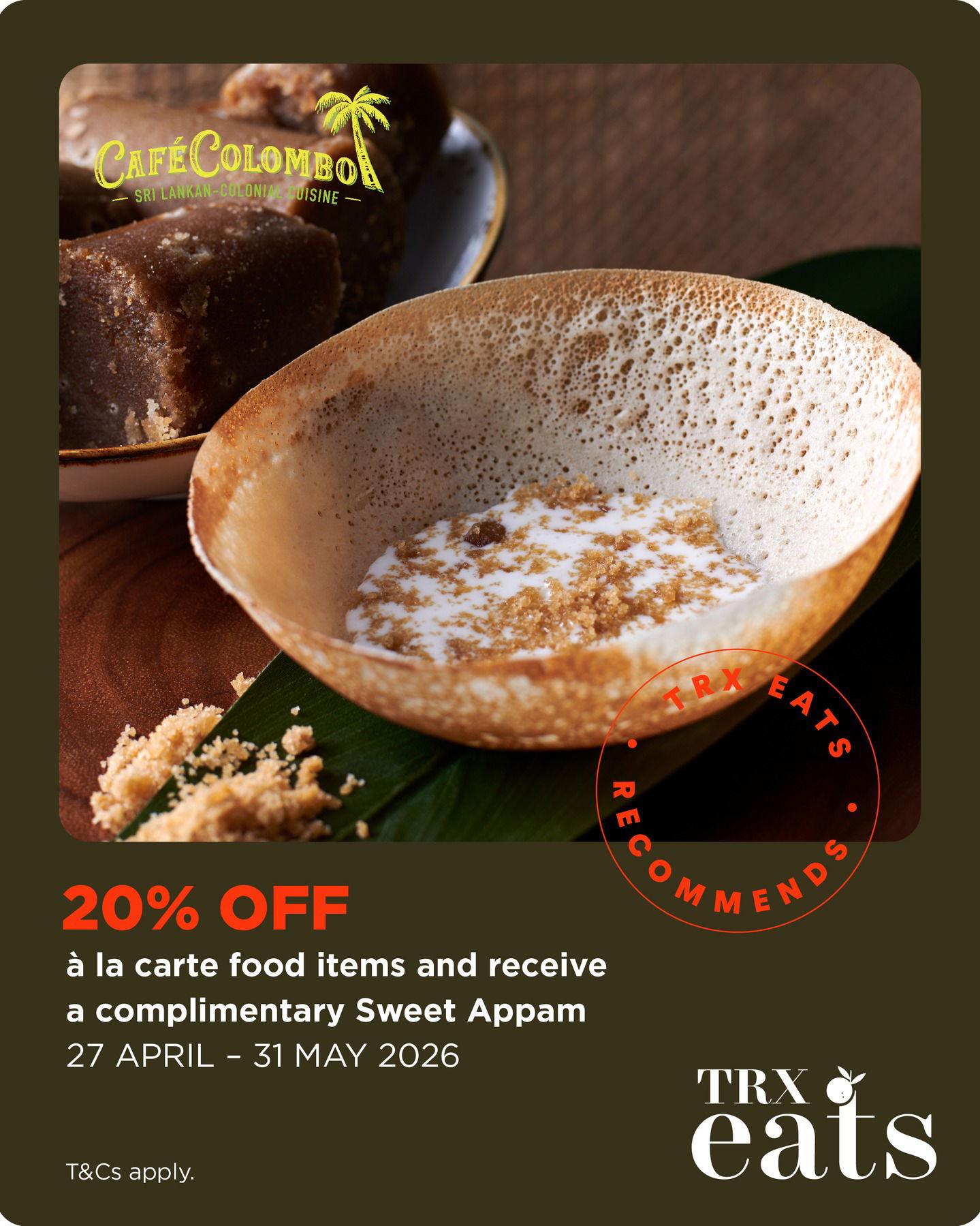 At Café Colombo, you’re getting 20% off all à la carte dishes, plus a complimentary Sweet Appom, which makes it a solid spot to kick off a chill brunch or dinner.
