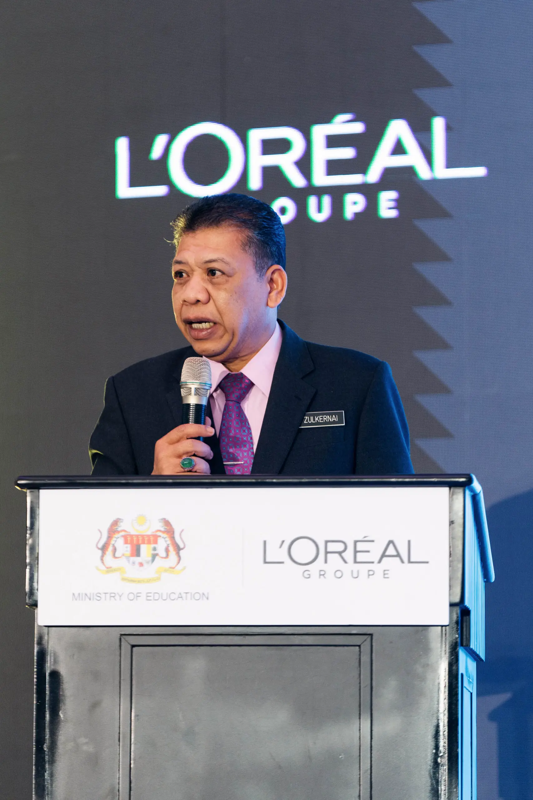 Senior Deputy Director of Technical and Vocational Education and Training (TVET), Ministry of Education, Encik Zulkernai bin Fauzi delivers the speech at the L’Oreal Corporate Showcase Event.