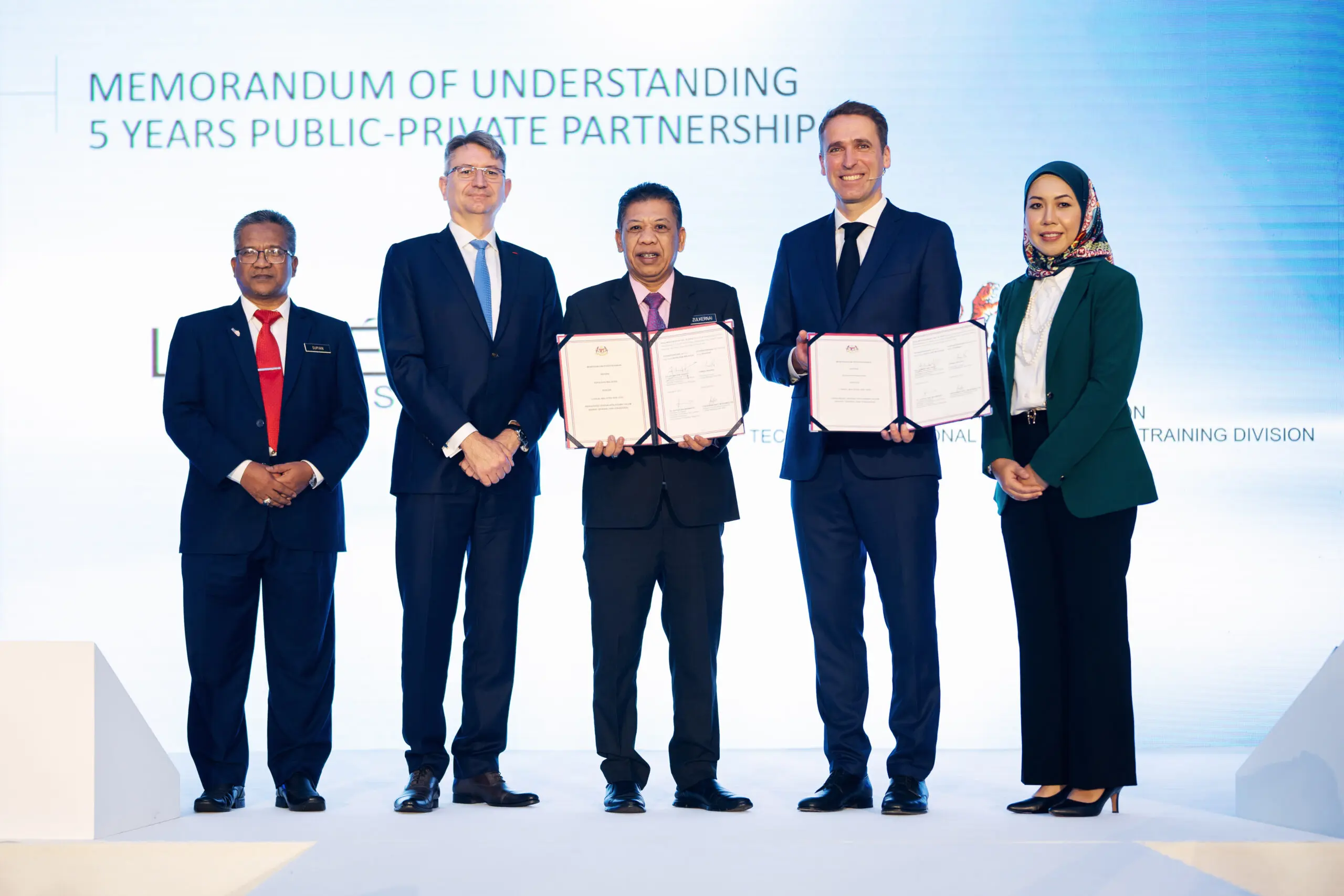 (From left) Deputy Director of Technical Vocational Education and Training Division (TVET), Ministry of Education, Encik TS.Supian bin Mahmood, The Ambassador of France to Malaysia, His Excellency Mr Axel Cruau, Senior Deputy Director of Technical Vocational Education and Training Division (TVET), Ministry of Education, Encik Zulkernai bin Fauzi, L’Oréal Malaysia Managing Director, Mr Tomas Hruska and L’Oréal Malaysia’s Corporate Affairs & Engagement Director, Puan Finaswani Mohamed Zin at the MOU signing ceremony today