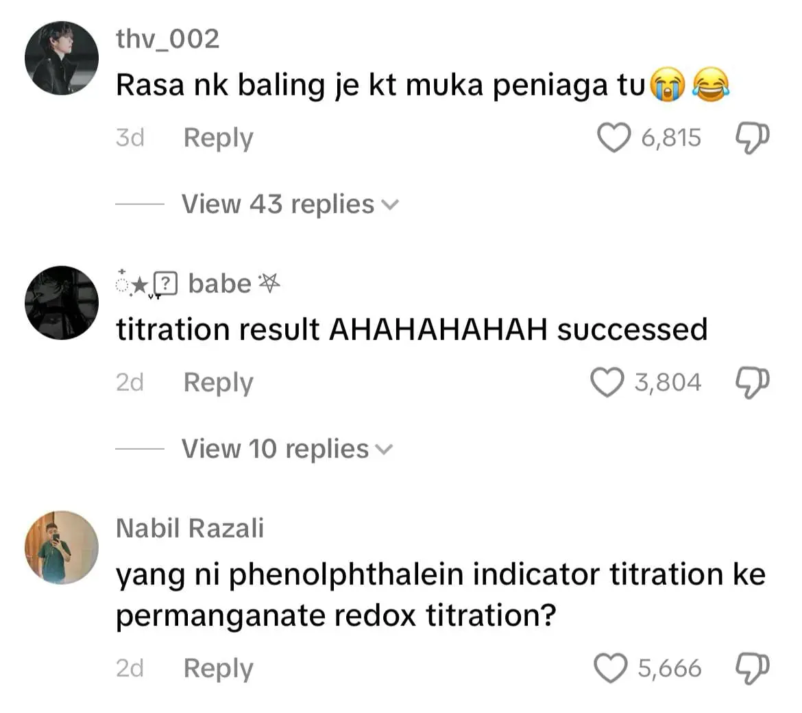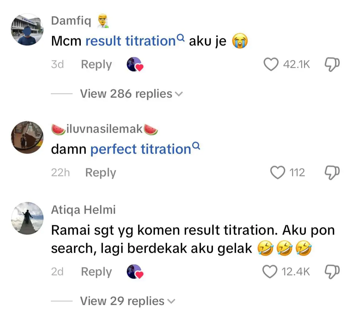 Ramai sangat yang komen result titration. Aku pun search, lagi berdekah aku gelak 🤣🤣🤣