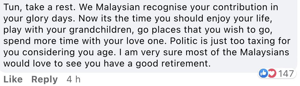 “Tun, take a rest. We Malaysians recognise your contribution during your glory days. Now is the time for you to enjoy your life, play with your grandchildren, go places that you wish to go, and spend more time with your loved ones.
