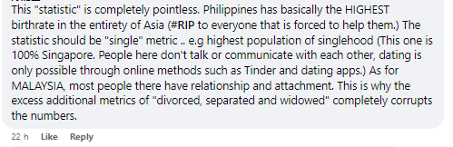 The netizen criticizes the inclusion of divorced, separated, and widowed individuals in the statistic on singlehood in Southeast Asia, suggesting it distorts the true picture of single life, especially in countries like Malaysia where relationships are common.